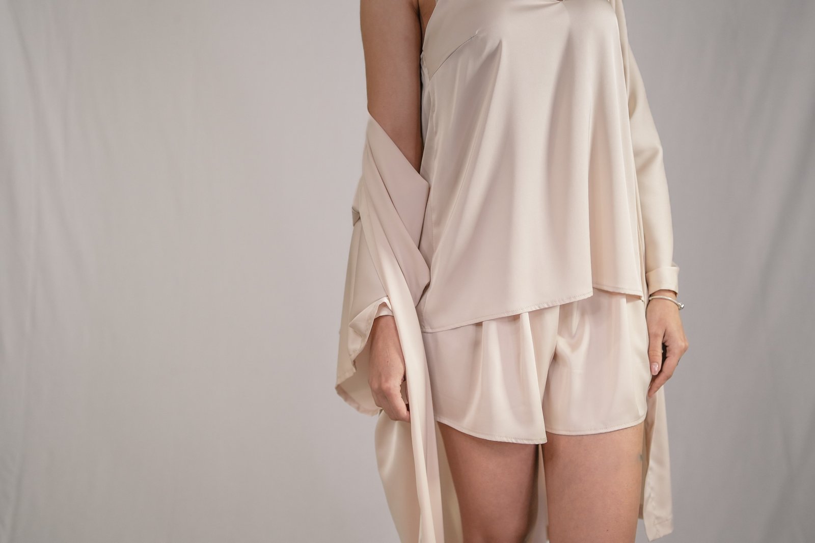 Questo completo intimo in seta Champagne è un vero e proprio inno al lusso e alla raffinatezza. Il set, composto da un chimono bralette e pantaloncino, unisce la tradizione del design orientale con uno stile moderno e seducente.