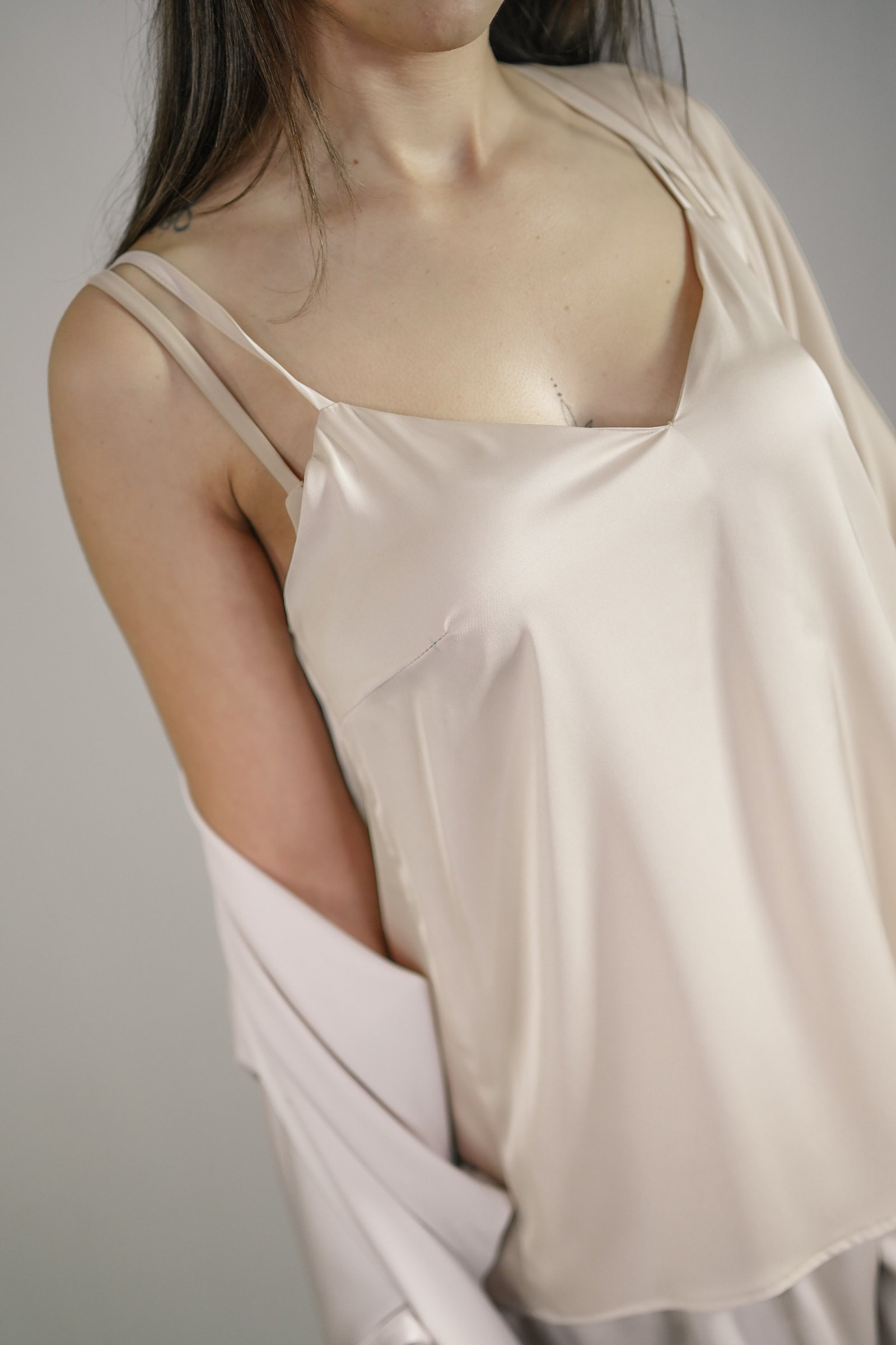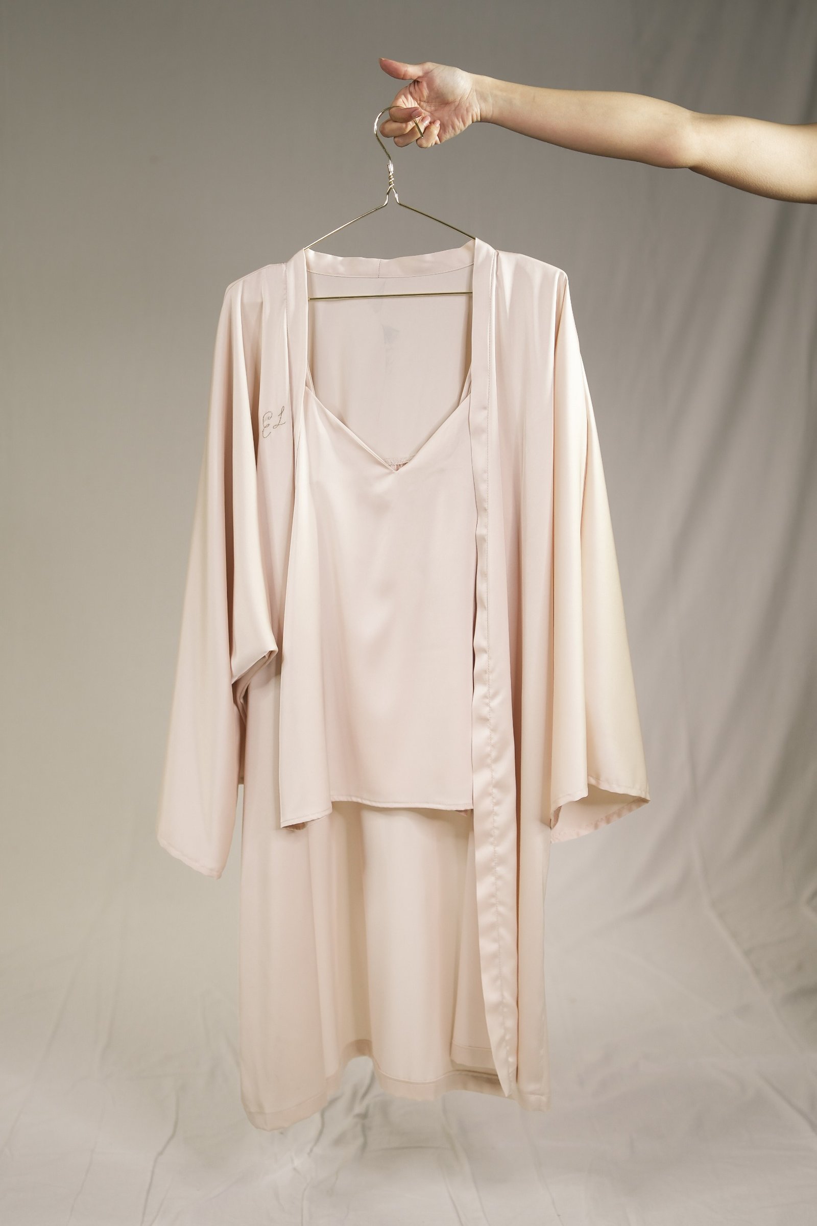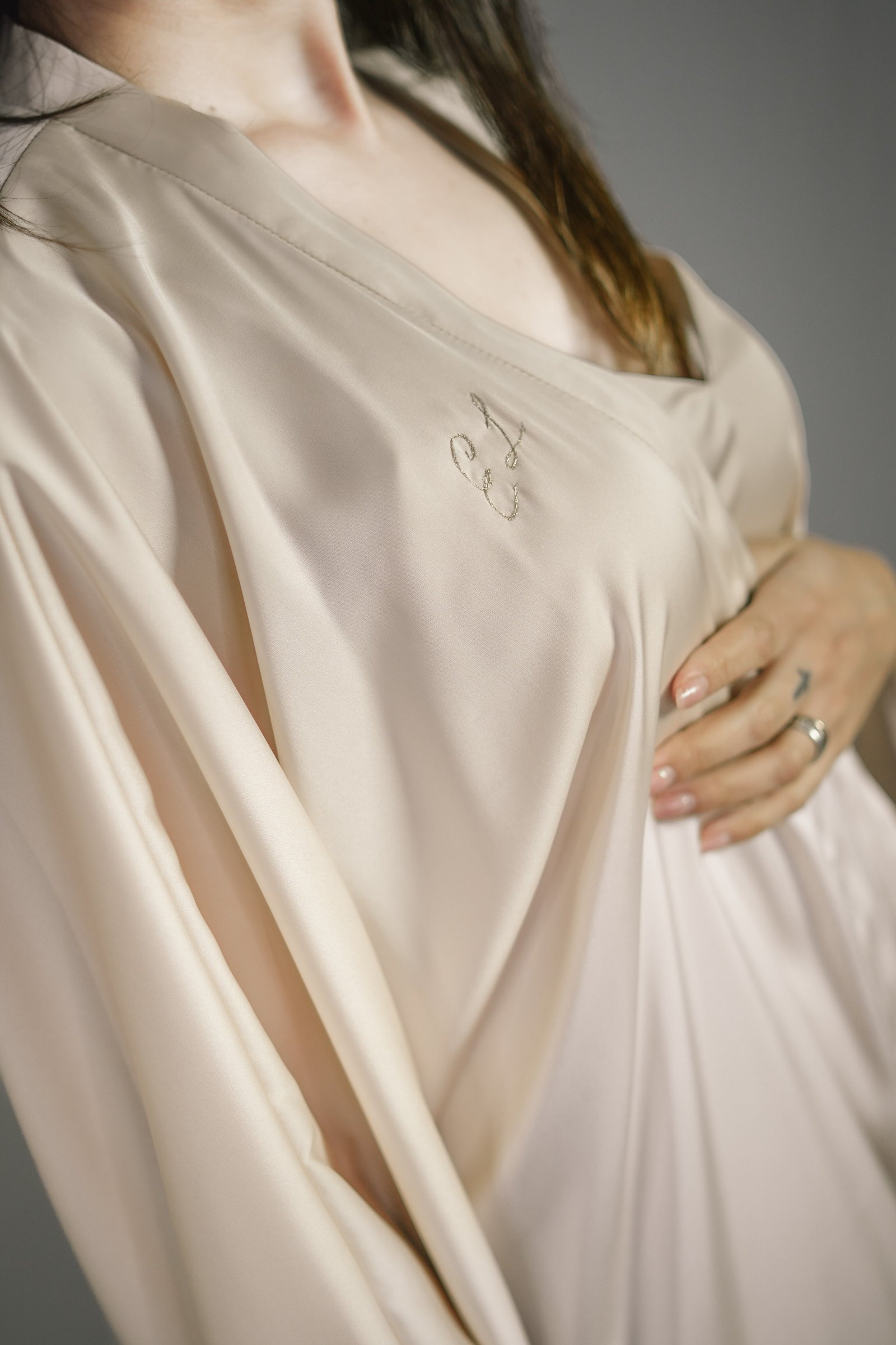 Realizzato in un tessuto morbidissimo, leggerissimo e di qualità superiore, questo capo trasmette una sensazione di piacere e benessere ad ogni tocco, rendendolo ideale per momenti di intimità e relax. La tinta Champagne, elegante e sofisticata, aggiunge un tocco di luce e raffinatezza, perfetto per chi desidera sentirsi esclusiva e impeccabile. Un dettaglio distintivo è rappresentato dalle iniziali del brand, ricamate a mano in oro, che impreziosiscono il capo aggiungendo un ulteriore elemento di lusso e autenticità artigianale.