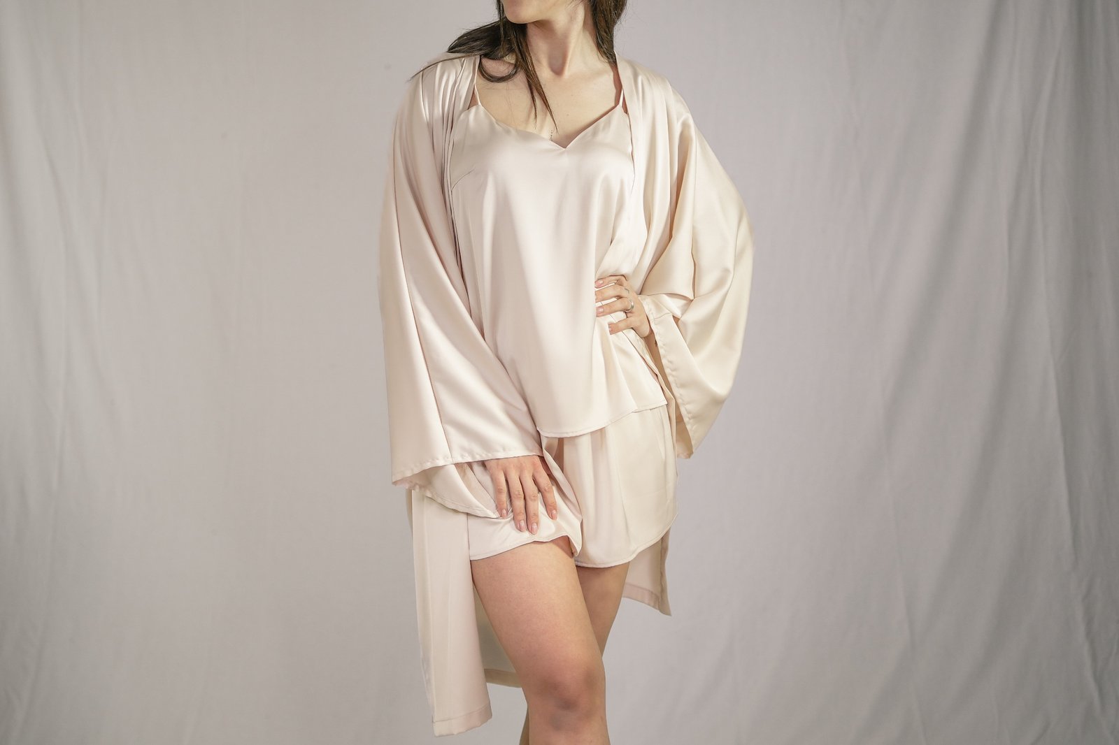 Il chimono, caratterizzato da ampie maniche che conferiscono un’eleganza fluida, avvolge delicatamente il corpo, mentre la sua silhouette raffinata si sposa perfettamente con la bralette studiata per esaltare la femminilità in modo discreto ma di impatto. Il pantaloncino, abbinato armoniosamente, completa l’insieme offrendo una vestibilità impeccabile e un comfort senza pari.